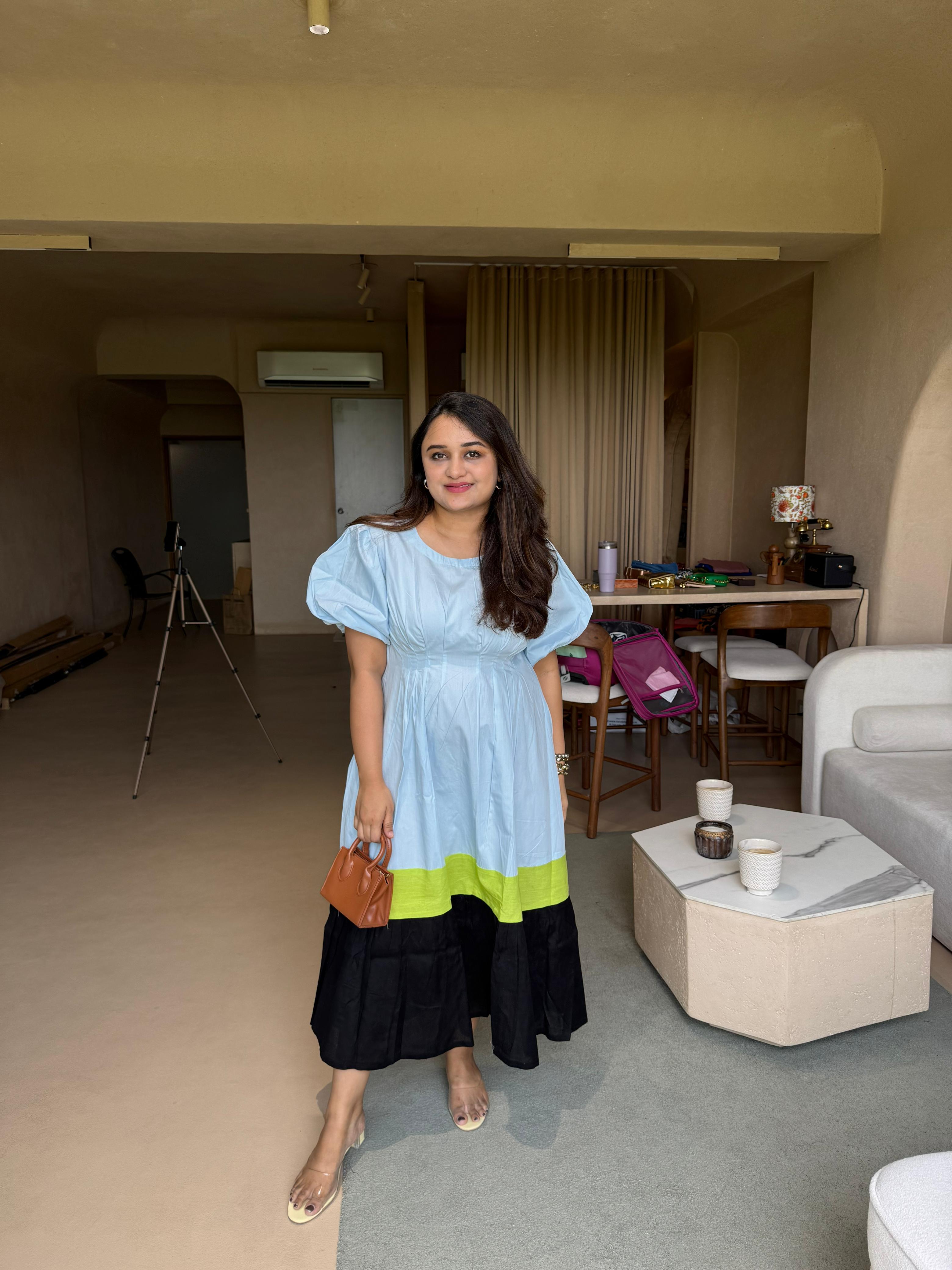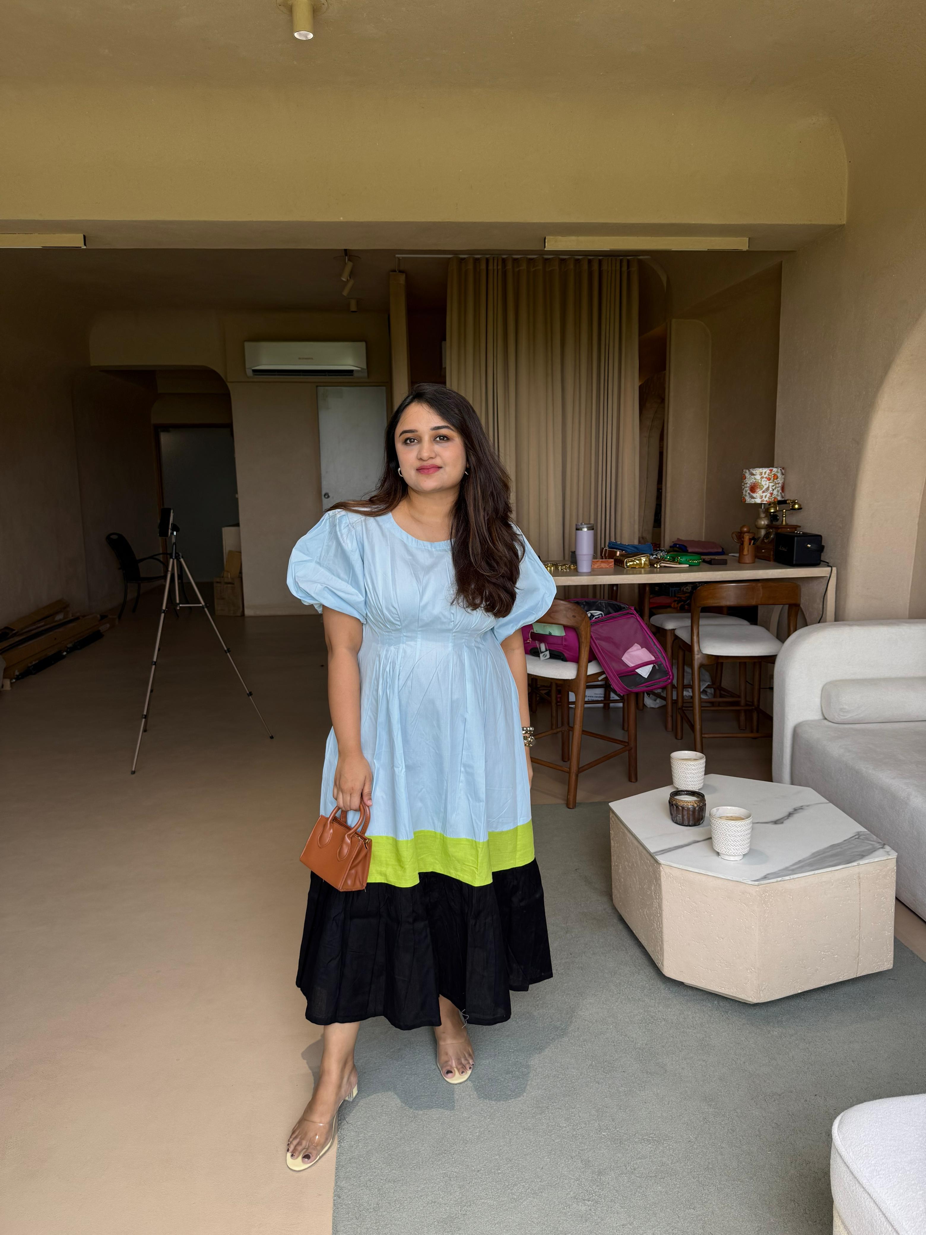 • Introducing our Powder Blue and Black Block Dress, made of high-quality linen cotton for a breathable and comfortable wear. Designed with puff sleeves, a round neck, and an elegant ankle length, this dress is perfect for any occasion. Upgrade your wardrobe with this versatile and timeless piece.