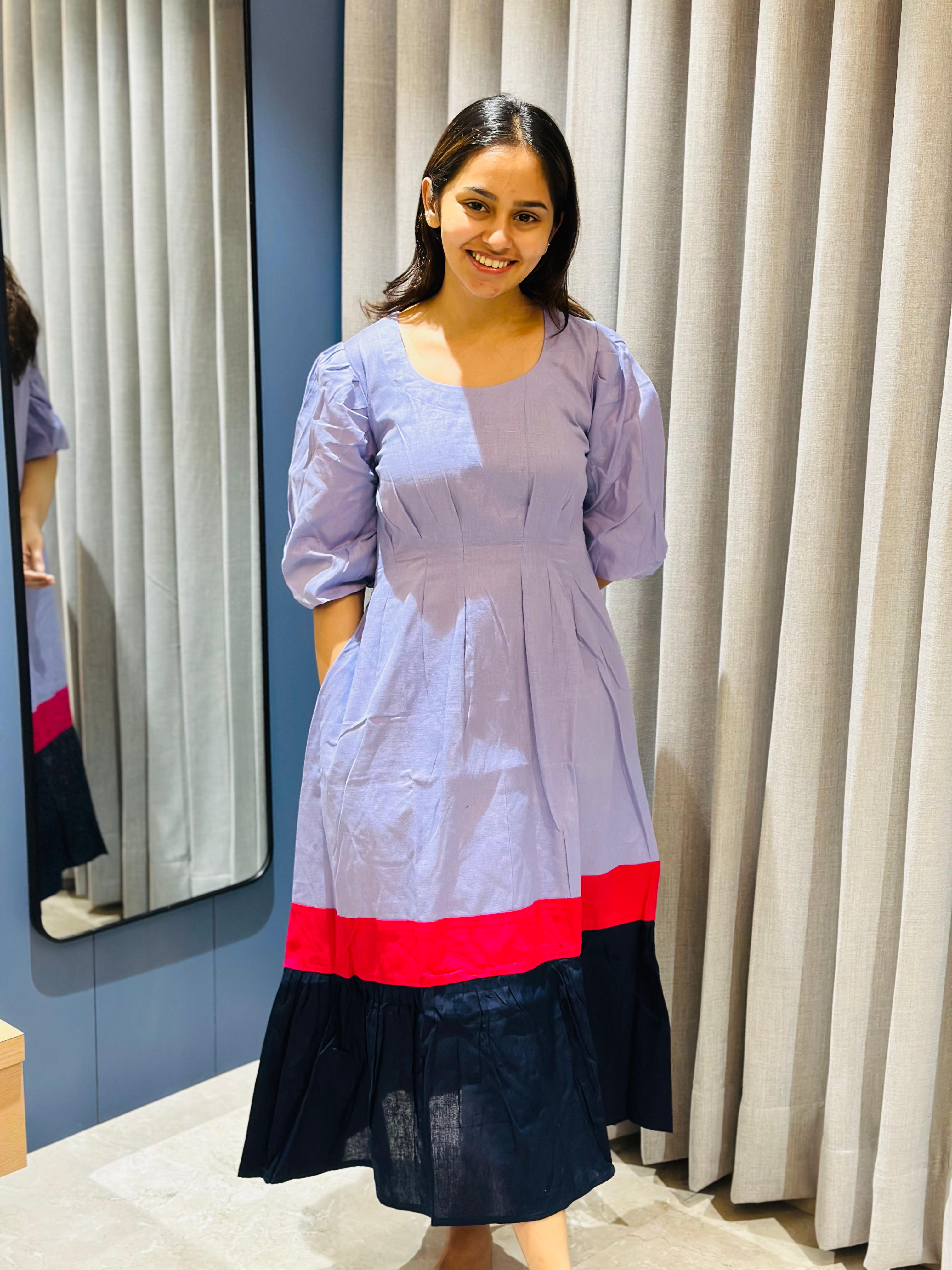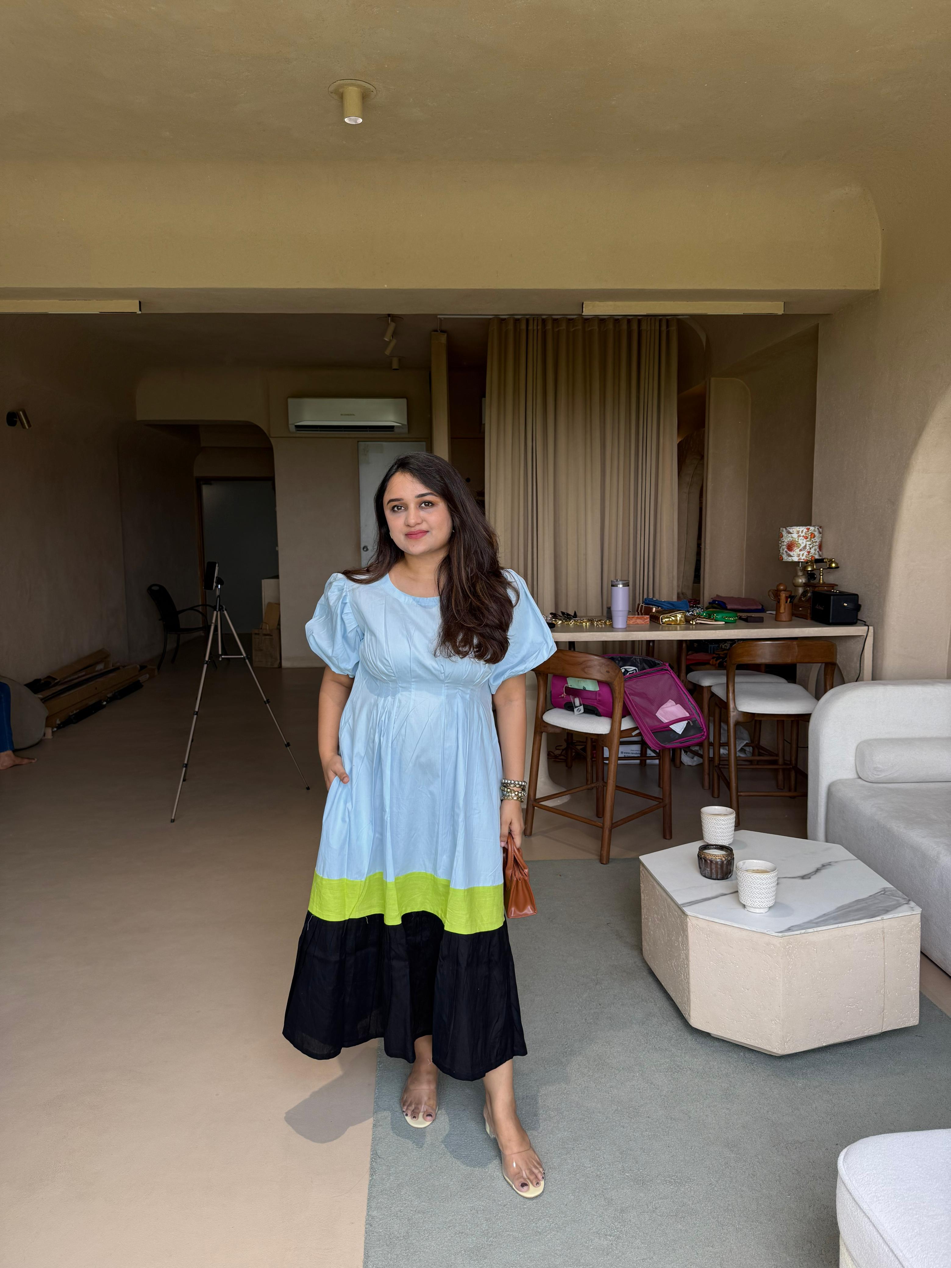 Introducing our Powder Blue and Black Block Dress, made of high-quality linen cotton for a breathable and comfortable wear. Designed with puff sleeves, a round neck, and an elegant ankle length, this dress is perfect for any occasion. Upgrade your wardrobe with this versatile and timeless piece.
